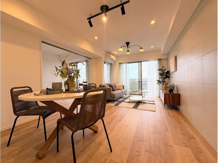 室内はリゾート感にあふれた設計で、開放的なLDKには心地よい潮風とたっぷりの陽射しが差し込みます。窓を開ければ波の音がささやき、海と一体になった暮らしをお楽しみいただけます。