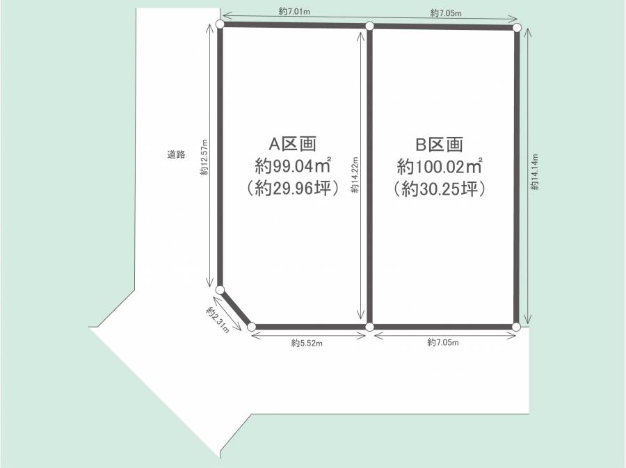 今回ご紹介する売地は南西角地の全2区画の分譲地で、対象地はB区画。南道路に面しており、陽当たりが良く開放的な空間が魅力です。