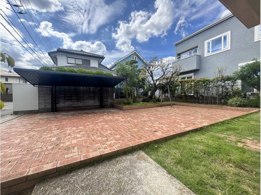 4台分駐車可能な広いカースペースはゲストを招いたガーデンパーティなど多目的な活用ができそう。
