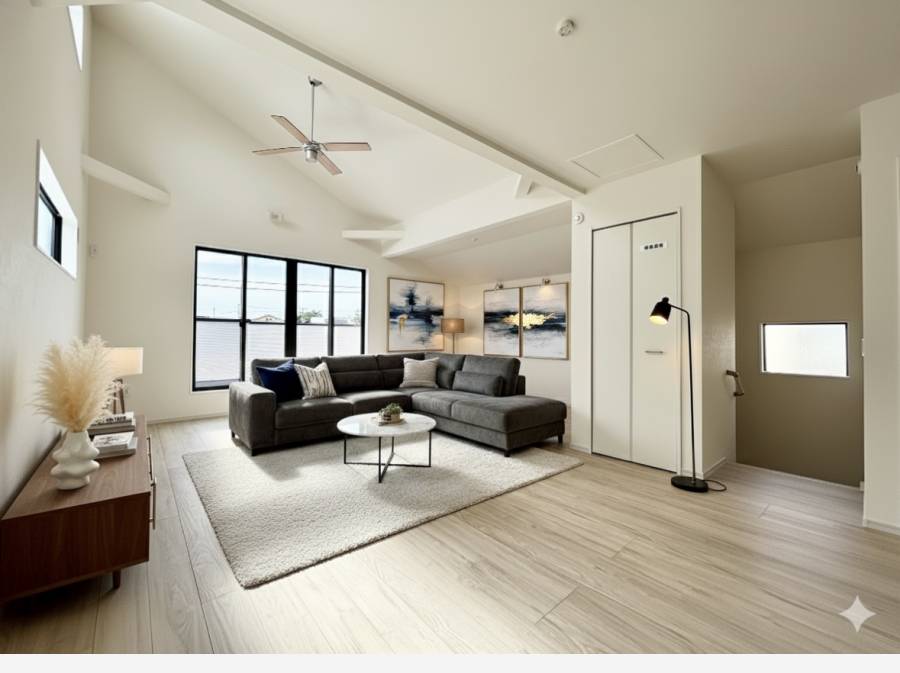 外観は白と黒のモノトーンを基調にしたスタイリッシュなデザインで、街並みに洗練された印象を加えます。室内は2LDK+S+WICのゆとりある間取りで、光と風が行き渡る開放的なリビングが魅力的です。収納も豊富で、快適な暮らしを支える設計となっています。