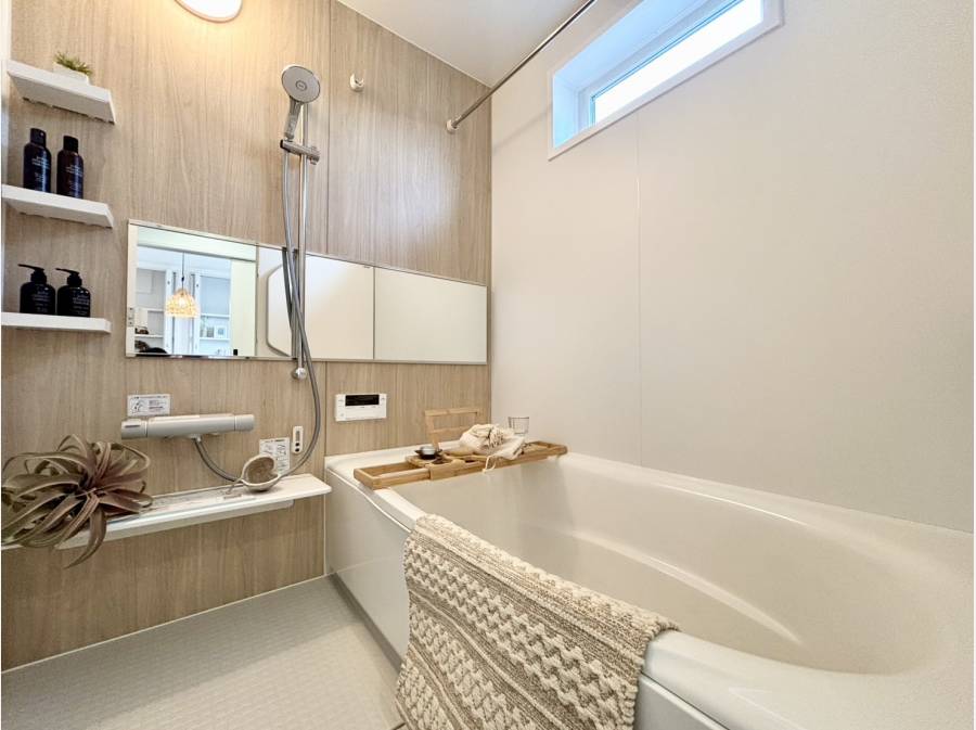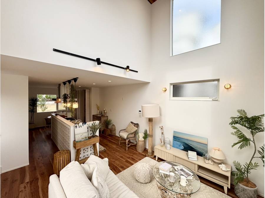 本邸宅は、住まうだけでなく、日常生活そのものを快適にする工夫が詰まった新築住宅です。3LDK・89㎡超の広さを持つ居住空間は、南東向きの配置により、自然光と風を心地よく取り入れ、室内全体に自然のぬくもりを感じられる設計となっています。吹き抜けのリビング階段は、家族が自然とリビングに集まりやすい設計で、空間の広がりと家族の交流が楽しめます。