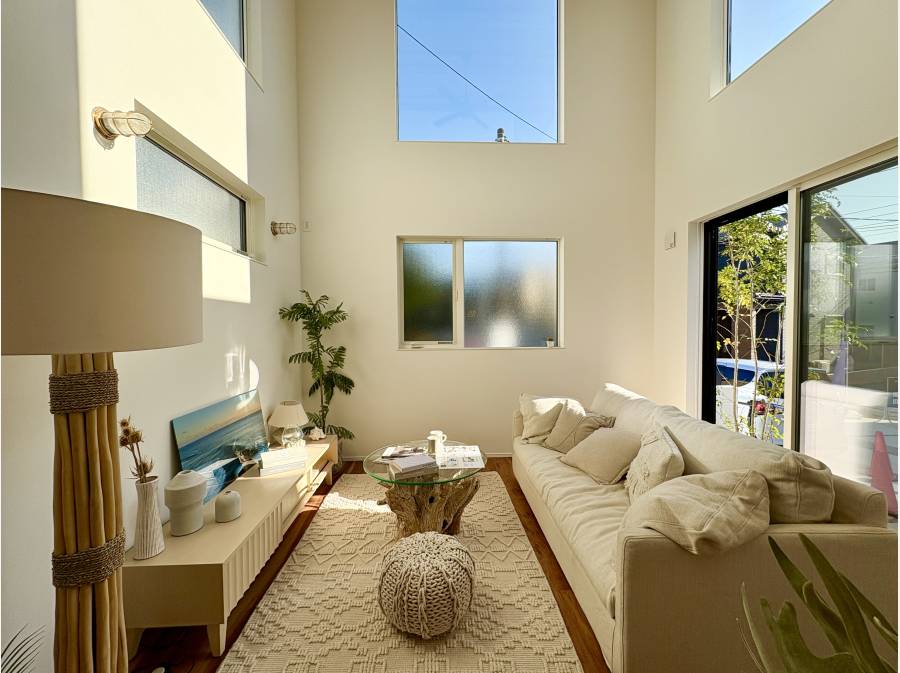 「吹き抜けリビング」は高い天井と高窓から湘南の光がたっぷりと差し込みます。シーリングファンが回る開放的な空間は、家族が自然に集まりたくなる心地よい空間です。