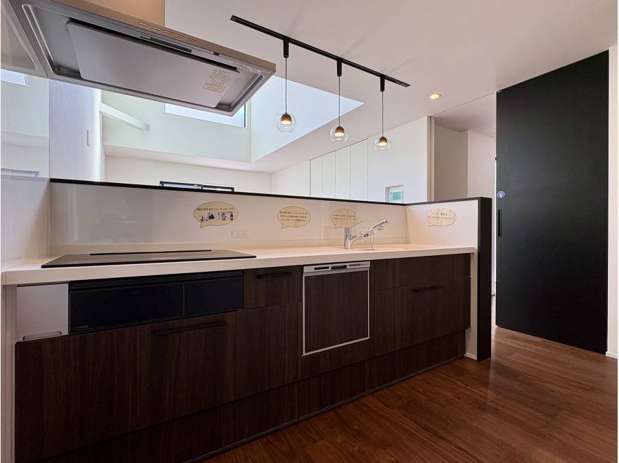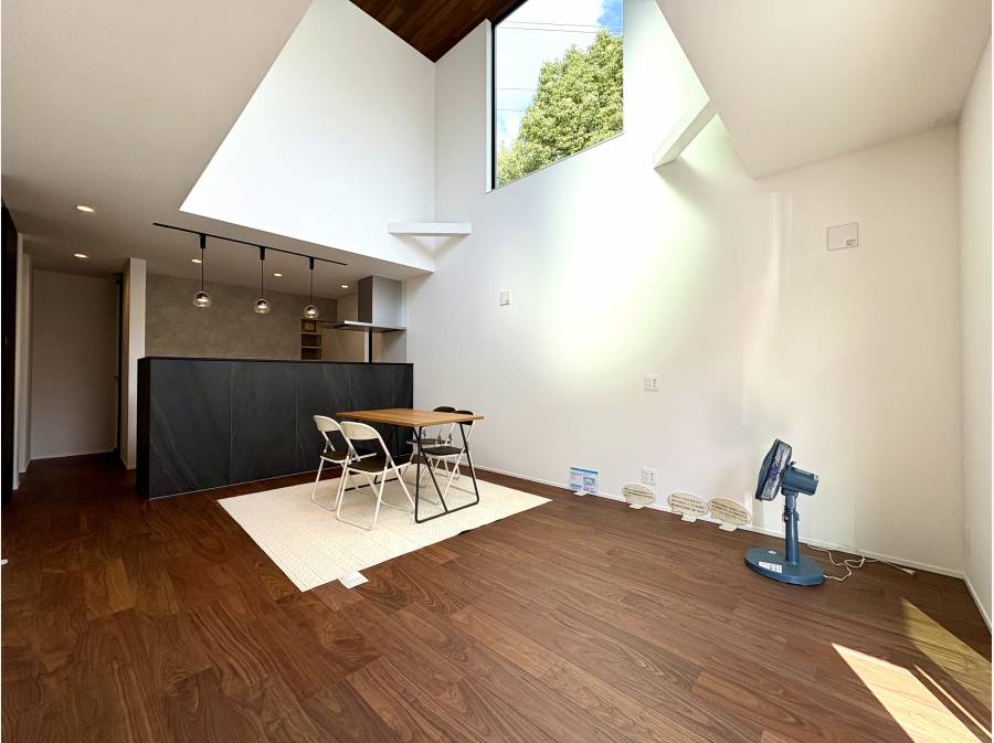 LDKの上部には、温かみのある板張り天井の吹抜けが広がり、開放感を演出。