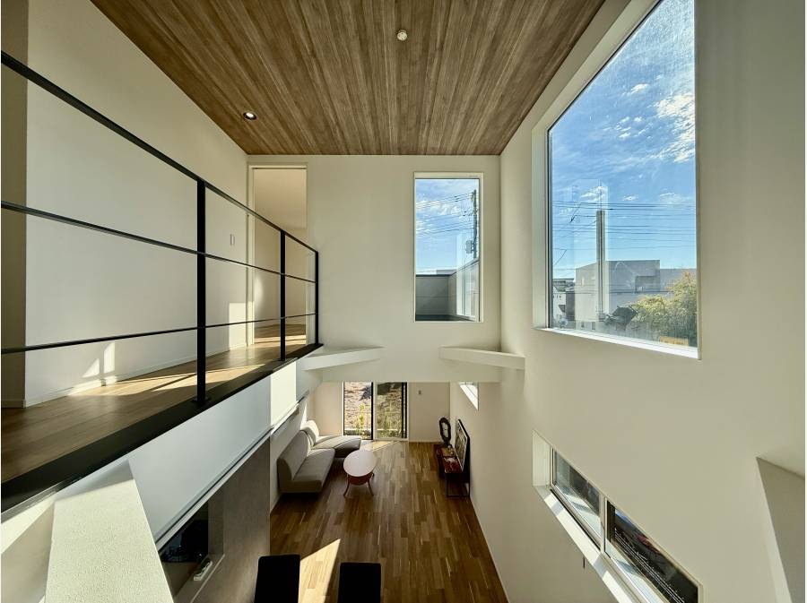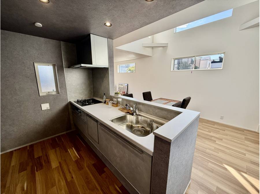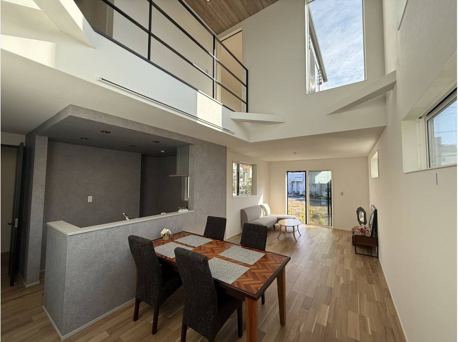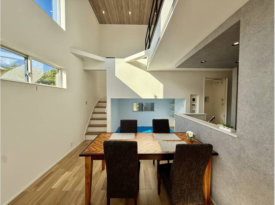 19帖を超えるLDKは吹抜けと高窓が特徴で、明るい光に包まれた開放的な空間。キッチンから見渡せる位置には畳コーナーがあり、お子様の遊び場やリラックススペースとして利用できます。