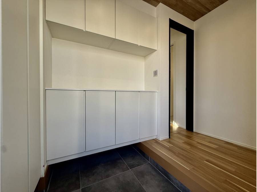 玄関にはシューズインクロークを設置。バスルームへとスムーズにアクセスできる動線設計は、海を身近に感じるロケーションを意識しています。キッチンも近く、日々の家事が効率よく進められる工夫が光ります。