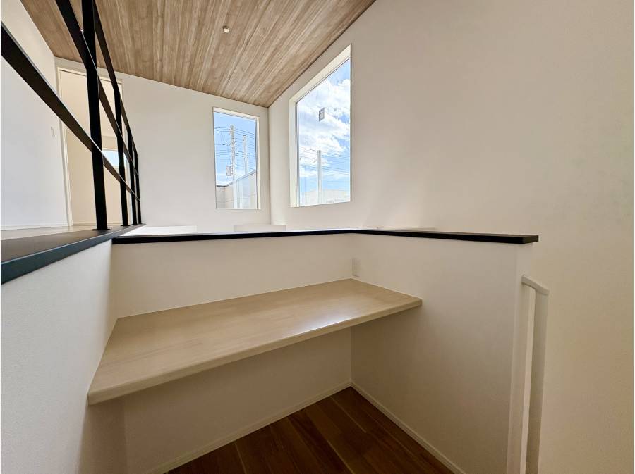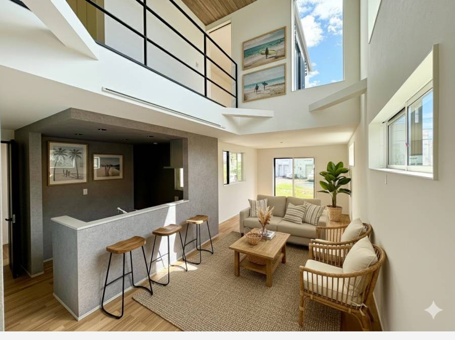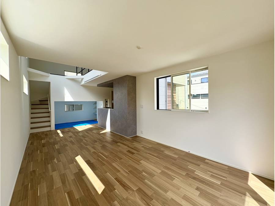 リビングには開放感あふれる広々とした空間が広がり、吹き抜けから明るい陽射しが差し込む設計となっています。
