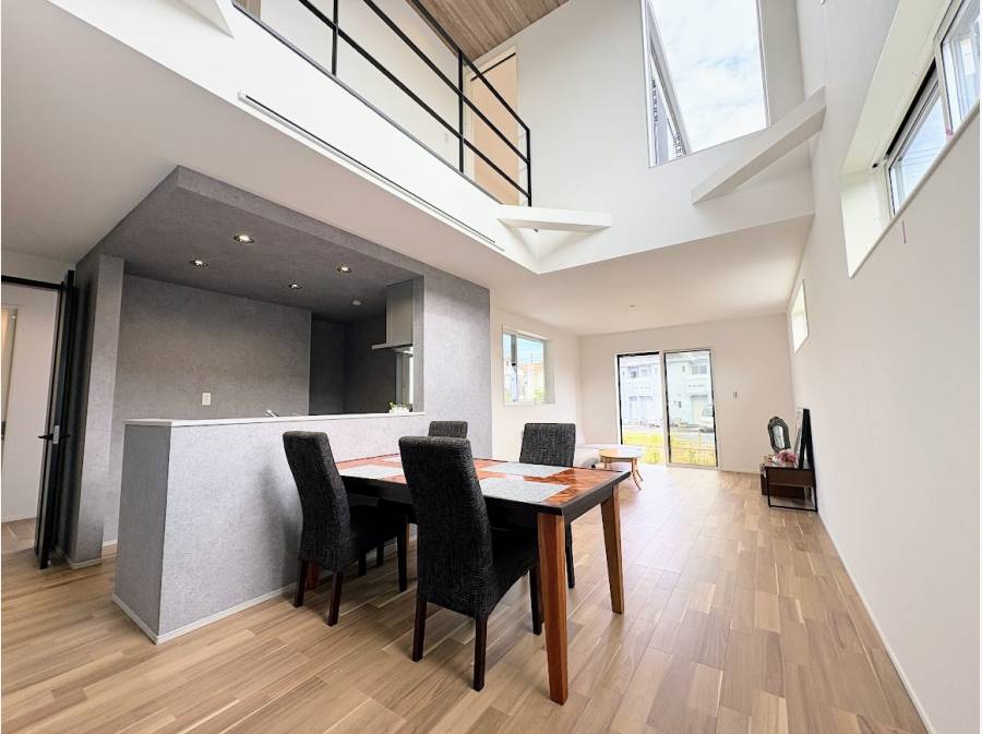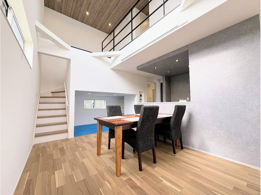 この物件の魅力は、広い土地面積とゆとりある空間設計にあります。約22帖を超える広々としたLDKと和室はワンフロアでつながり、吹き抜けのデザインがさらなる開放感を演出。家族みんながゆったりと過ごせる、心地よい空間が広がります。