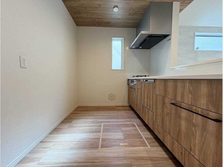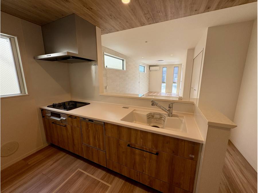 キッチンは食洗機付きの対面スタイルで、パントリーも備え、調理や収納をサポート。