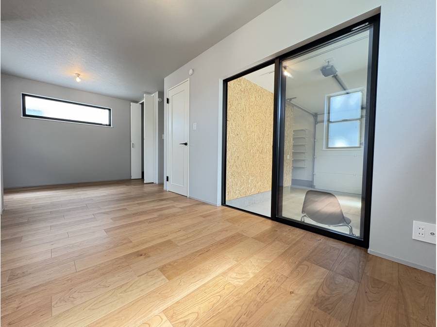1階は電動シャッタ-付のガレージ、ガレージと繋がるお部屋が約10帖のスペース付『壁造作で2部屋にすることも可能です!(有償)』
