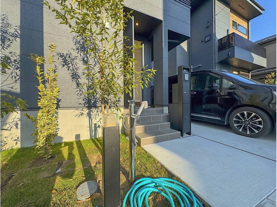 外壁の一部にはウッド基調の建材を使い、植栽を植え、