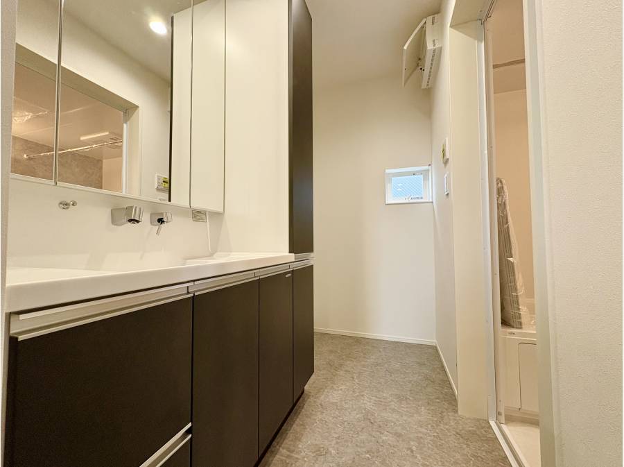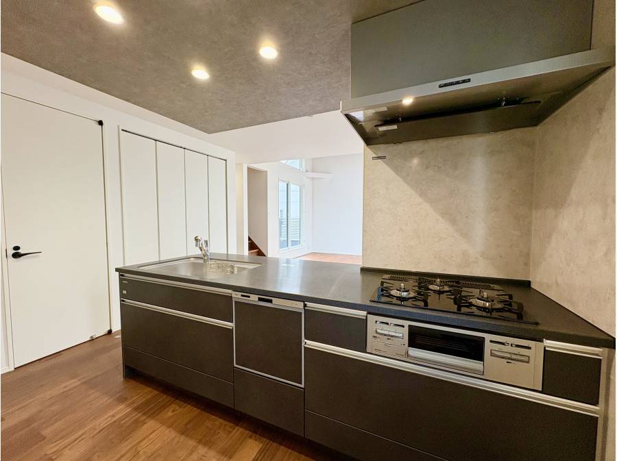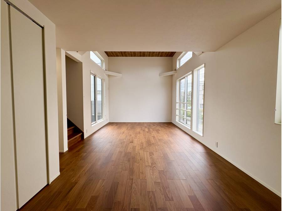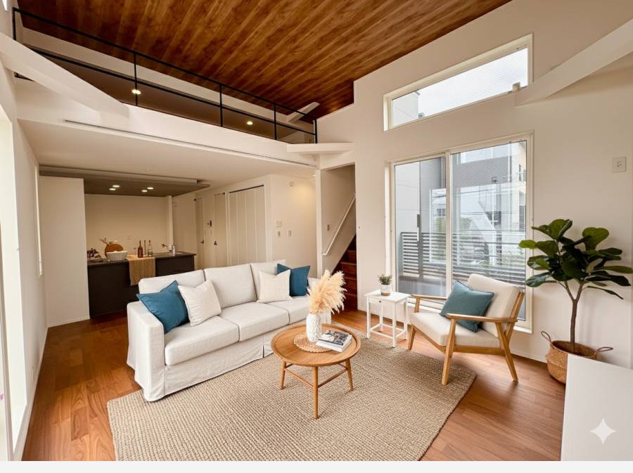 リビングは広々とした空間で、明るい陽射しが差し込む開放的な設計。家族が自然と集まり、食事や団らんのひとときを楽しむのにぴったりです。キッチン周りには収納も充実しており、毎日の家事も快適に行えます。