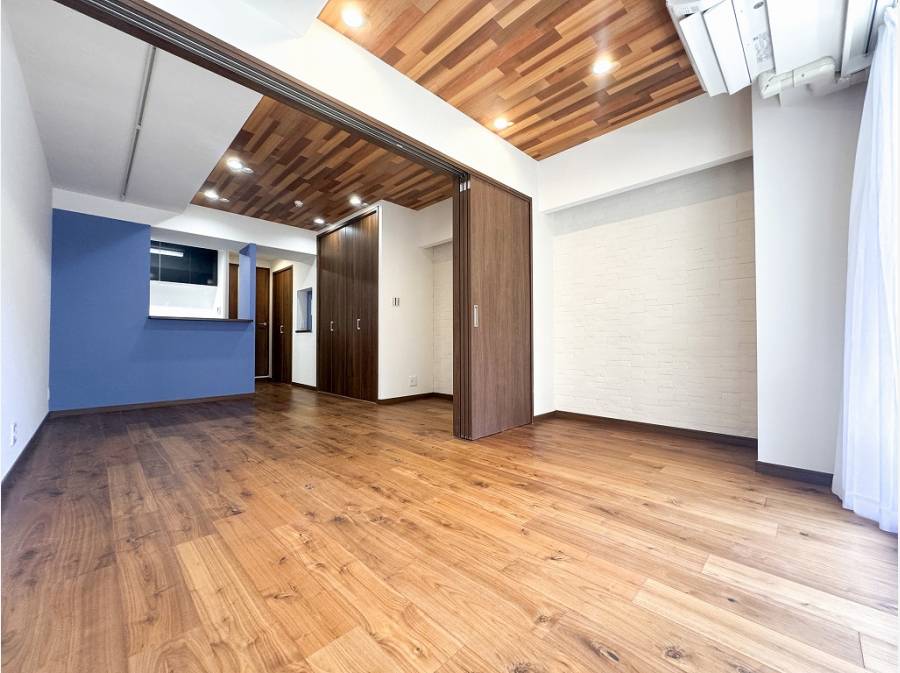 木質感溢れる暖かみある空間にブルーのアクセントカラーが際立つおしゃれな室内。