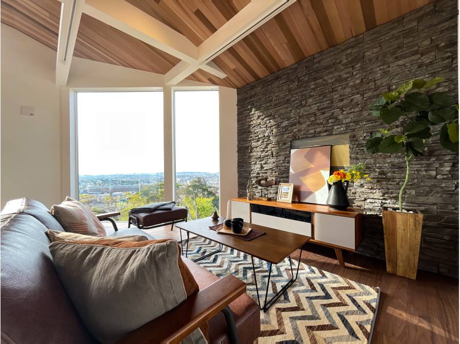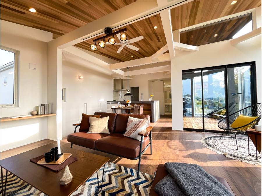 自然と便利さが調和した鵠沼の暮らし。勾配天井が空間に広がりを与え、デザイナーズの上質さを実感できます。