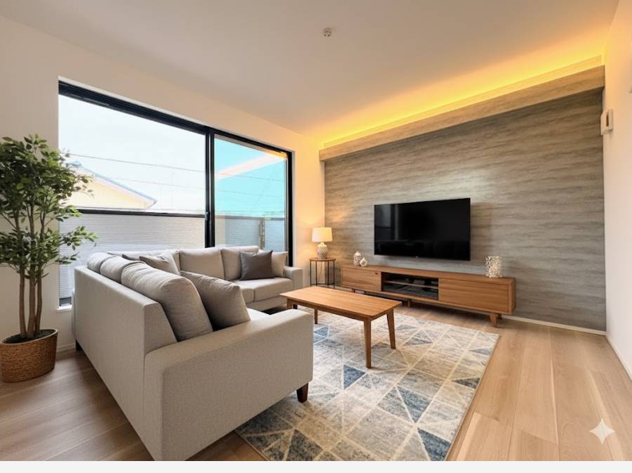 このお住まいのポイントは、家族が自然と集まるLDKの心地よさにあります。約18.6帖の広々としたLDKには大きな窓があり、明るい日差しが差し込む暖かな空間が広がっています。さらにバルコニーにも直接アクセスでき、開放感もたっぷりです。