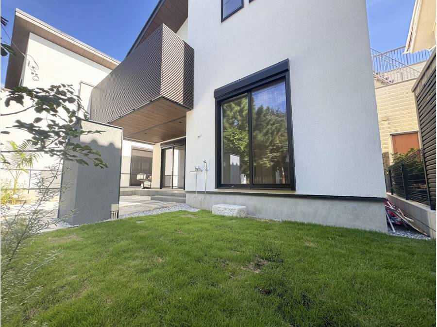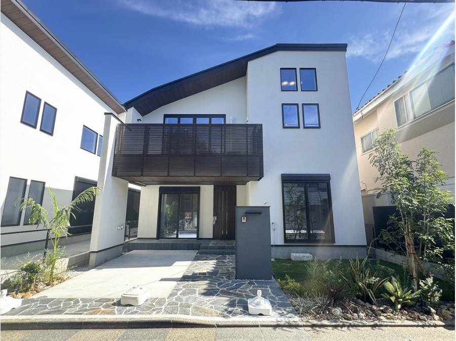 外構の植栽や石張りがリゾート感あふれ、毎日充実した気持ちで暮らせるデザイナーズハウス。