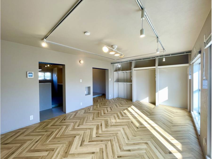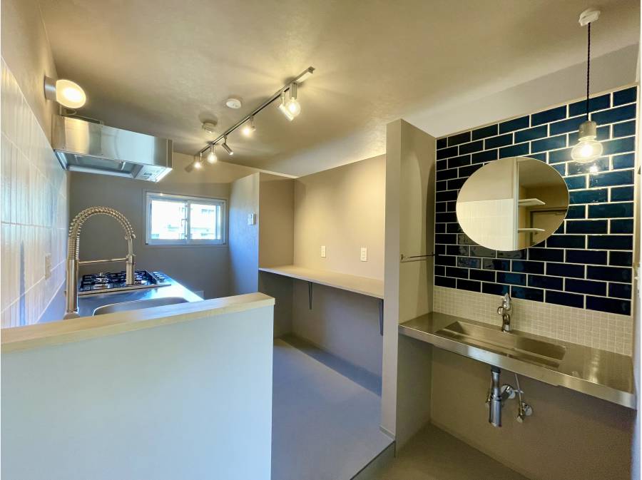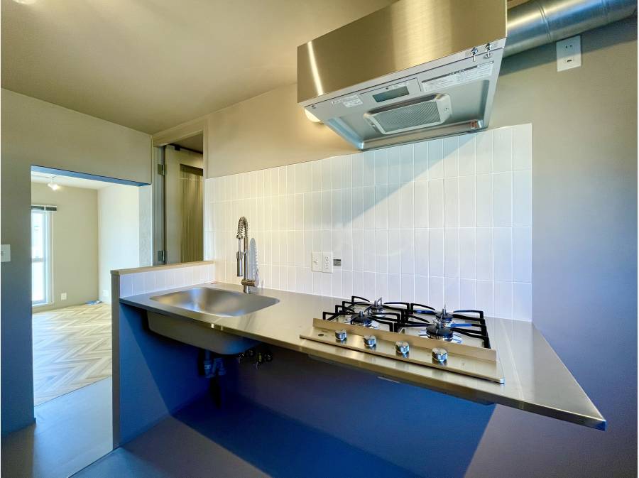 間取りは2LDKで、小上がり空間や通り土間など、多様な用途に対応できるフレキシブルな設計が魅力です。シンプルにデザインされたステンレスキッチンも、空間のミニマルな美しさを引き立てています。