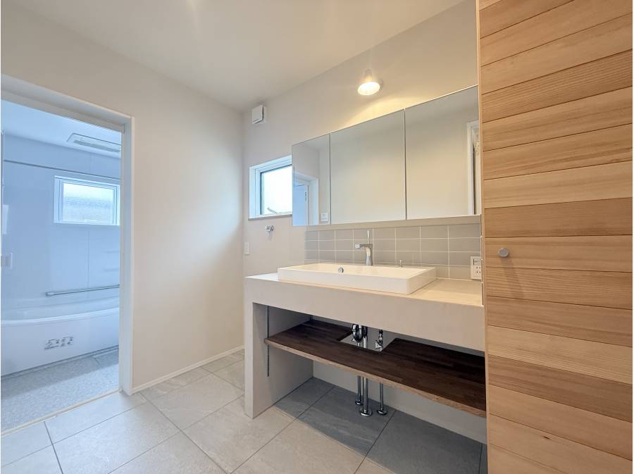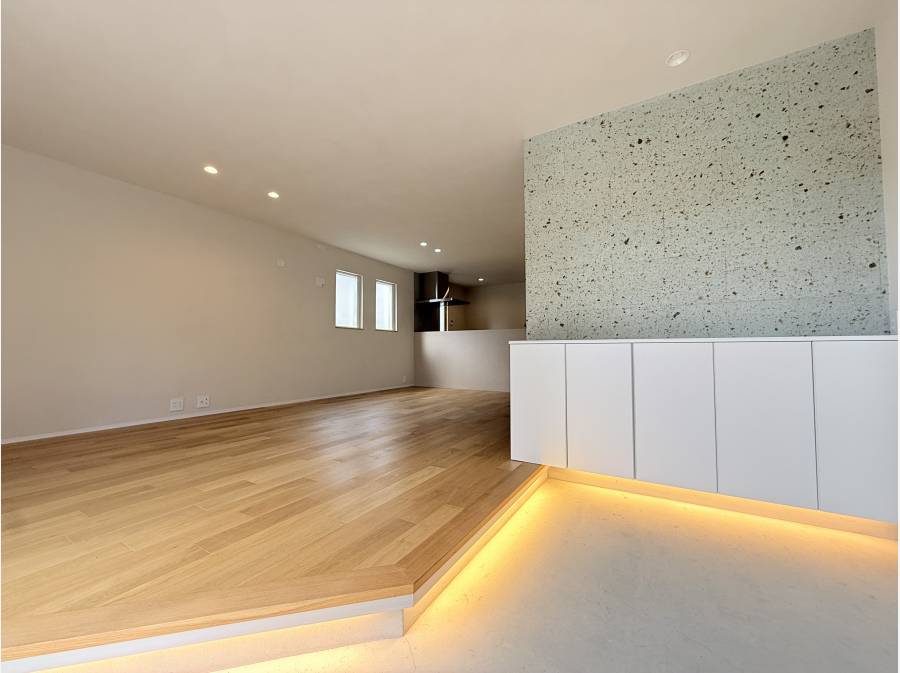 室内には塗り壁や無垢材といった天然素材を取り入れ、キッチンには存在感豊かな楢の一枚板を採用。手触りにもこだわり、素材を通して“丁寧な暮らし”の魅力を感じる空間です。