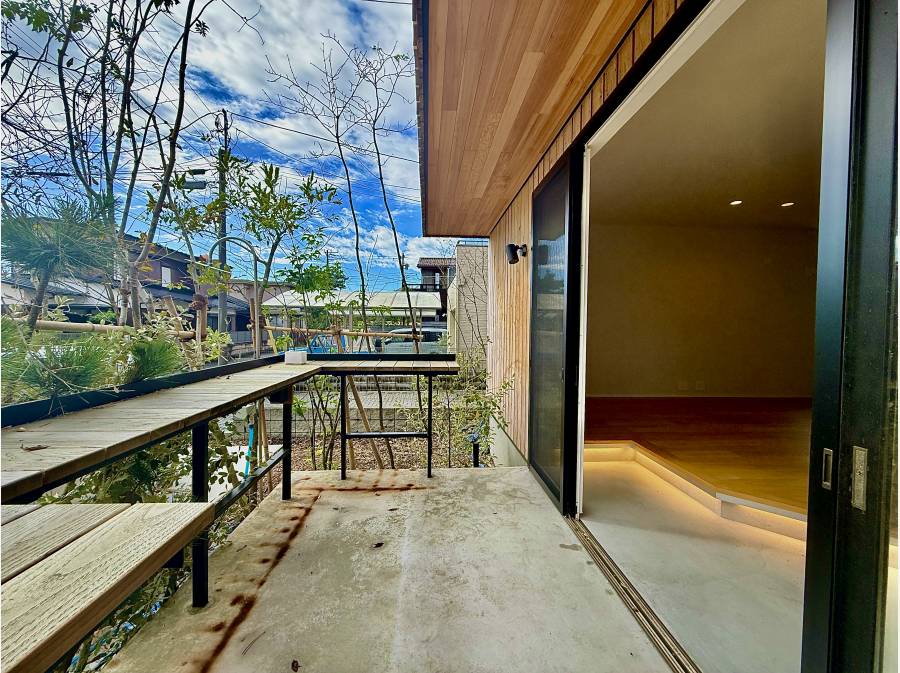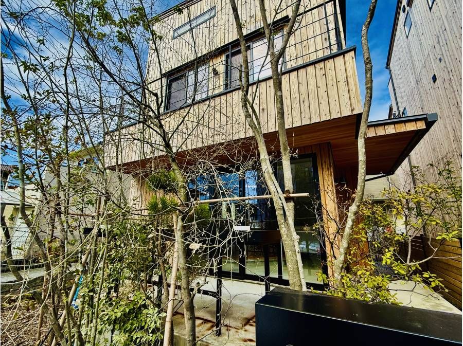 太陽の力を巧みに取り入れる“パッシブデザイン”の住まいは、四季折々の心地よさをそのまま楽しめます。外観は屋久島杉の木張りが印象的で、洗練されたフォルムと温かな雰囲気が調和。美しい植栽と自然に馴染み、街並みにも品よく溶け込んでいます。
