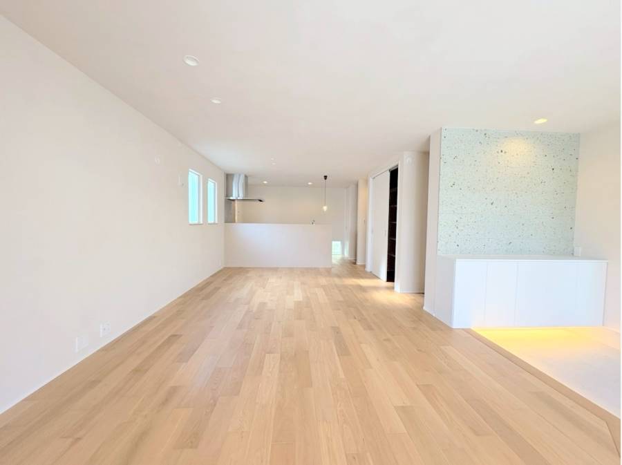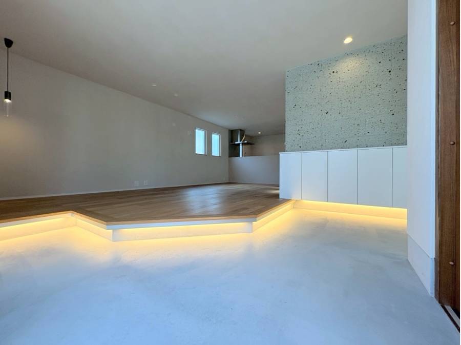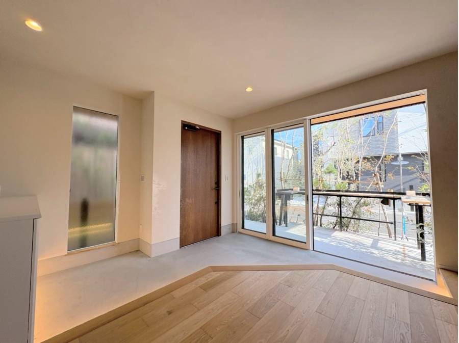 エントランスを抜けると、約21帖の広々としたLDKが広がり、土間スペースとテラスが自然につながる心地よい空間が広がります。