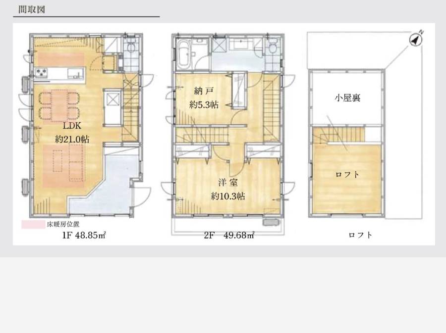 | 間取り | 1LDK + 納戸(5.3帖)+ロフト+小屋裏収納 間取り・区画図を取り寄せる | 構造・階建て | 木造 地上2階 |