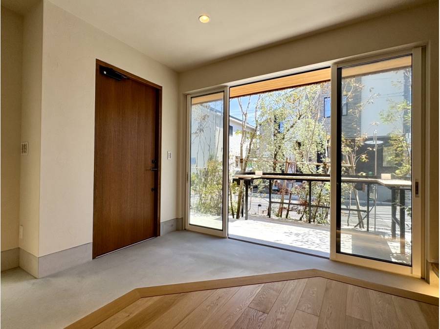 玄関から続く広い土間は、屋内外をゆるやかにつなぐ空間として設計されています。