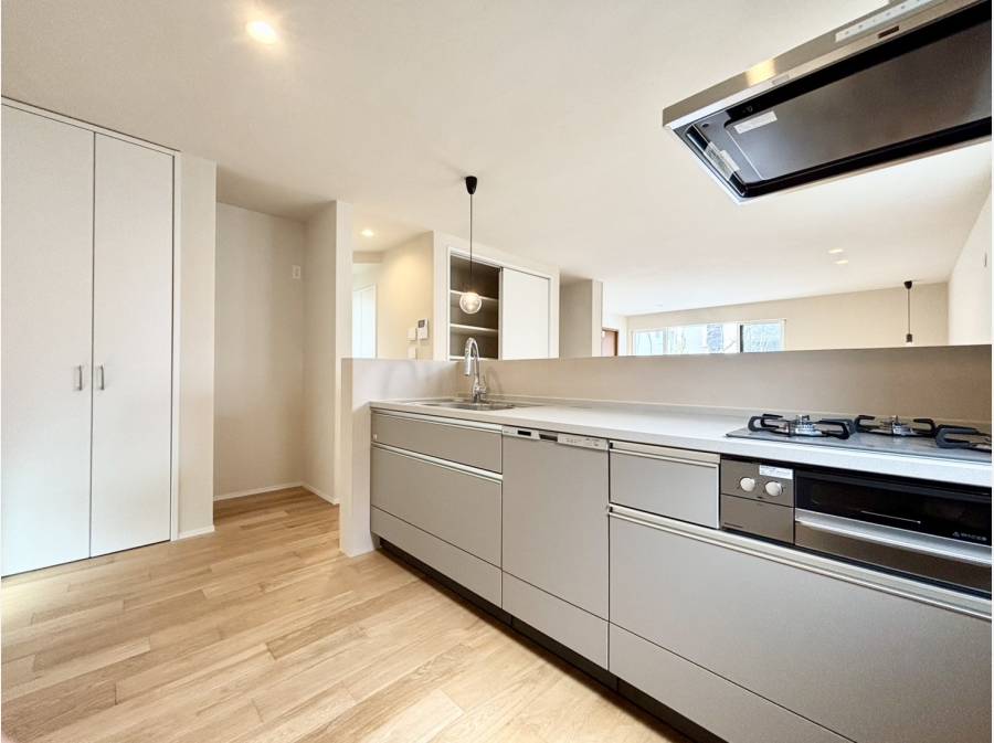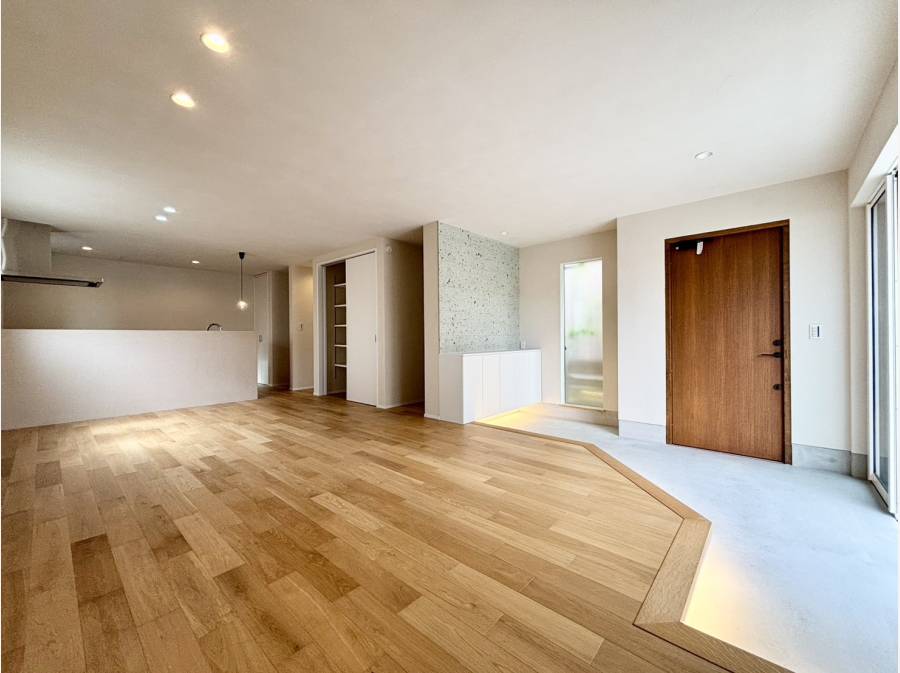 21帖を超える広々としたLDKは、土間のような開放感あるエントランスとつながり、内と外の境界がゆるやかに溶け合います。窓からは緑豊かな風景が広がり、日々のストレスを忘れさせてくれるでしょう。