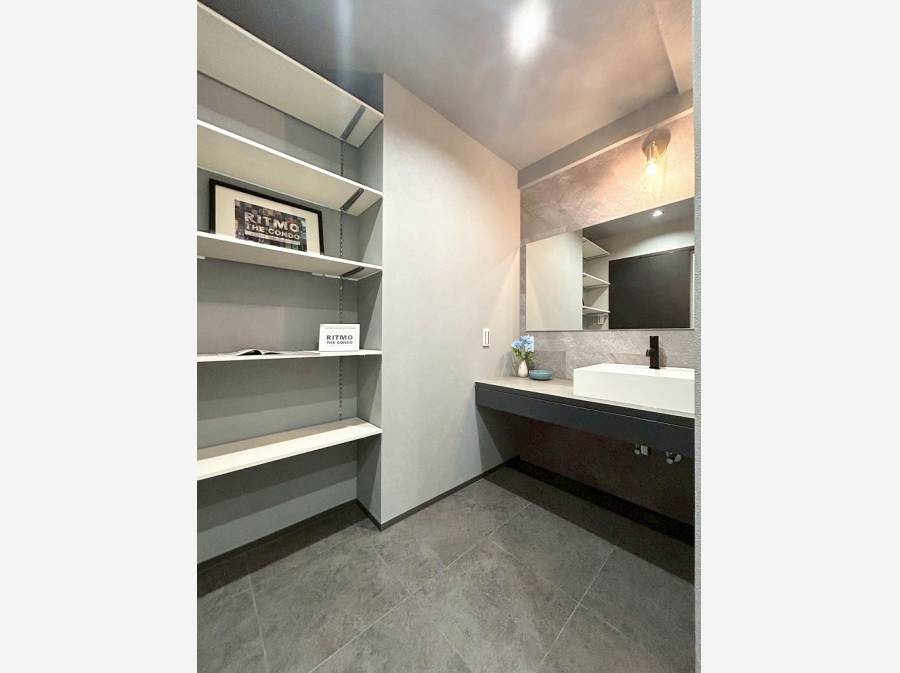 すぐ横にはオープンシェルフがあるので、お気に入りの家電やマグカップ、インテリアを並べてお部屋をコーディネートしてください♪