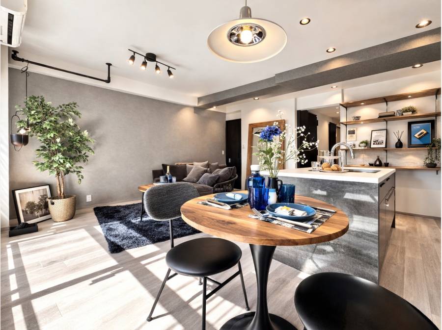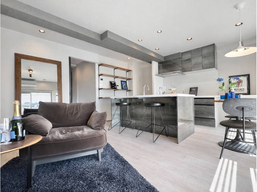 藤沢駅徒歩5分。街の利便と住まいの上質を両立するリノベーション住戸です。室内は53.46㎡のゆとりある1LDK。主役は、空間を引き締めるブラックキッチンと、カウンターを囲む“BARのような”ダイニング。照明の陰影が心地よく、夜が似合う大人の住空間に仕上がっております。