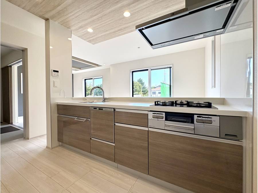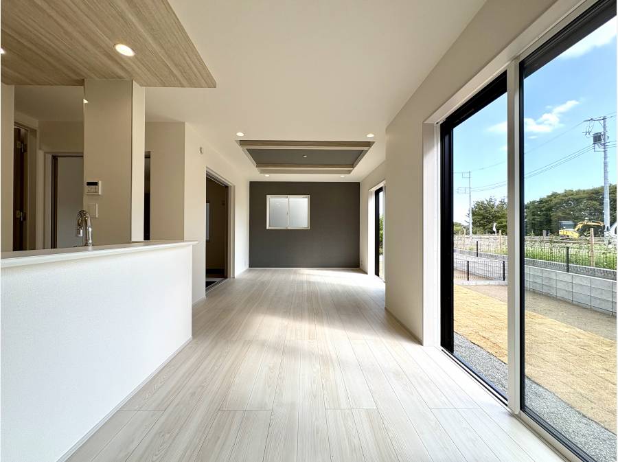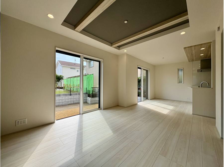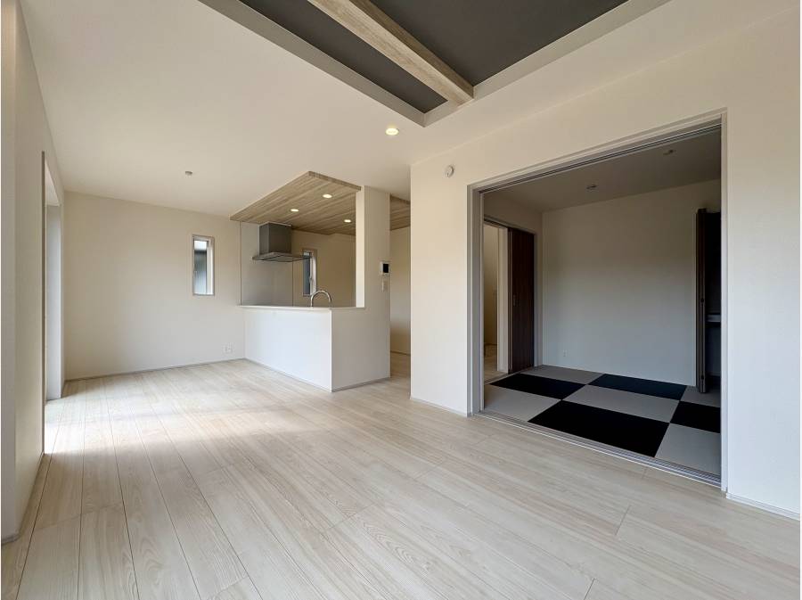広々としたLDKは、折上天井や勾配天井を取り入れた工夫が施され、空間に奥行きと開放感をもたらします。毎日の暮らしに明るさと快適さを感じられる設計です。