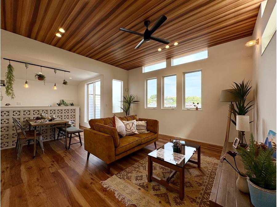 天井高約2.9mのリビングにはシーリングファンが設置され、まるでホテルのラウンジのような優雅で快適な空間を提供します。