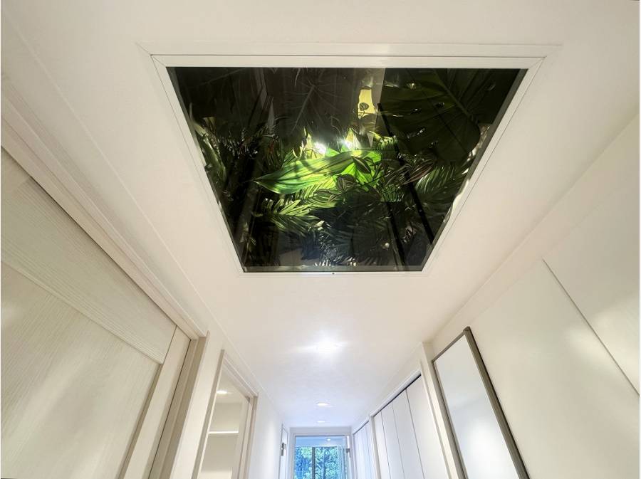 室内へ入るとトップライトが描く光と緑の演出に目を奪われます。