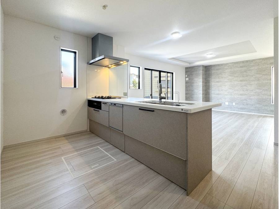 大きな窓を配したリビングダイニングには床暖房が完備され、寒い冬も暖かく過ごせそう。