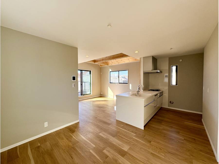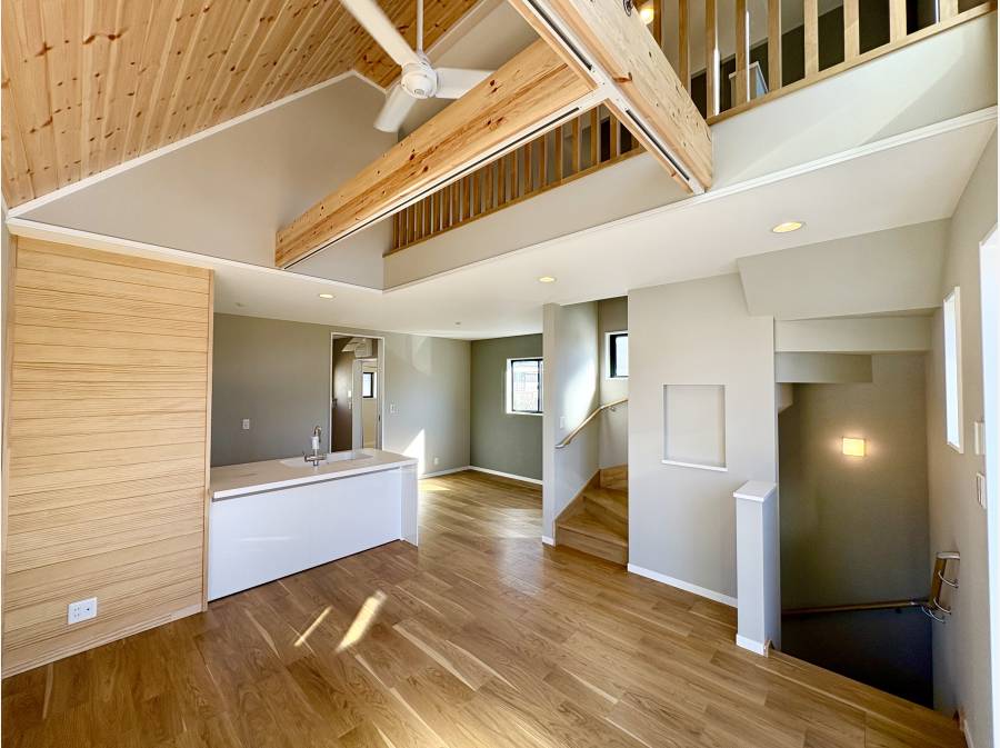 約16.4帖のLDKには吹き抜け天井が採用され、開放感を演出。南向きのバルコニーからは明るい日差しが差し込みます。断熱等級5をクリアする性能や、高さ2.3mのハイサイズドア、無垢板張りの天井など、細部までこだわった仕様が標準装備されています。