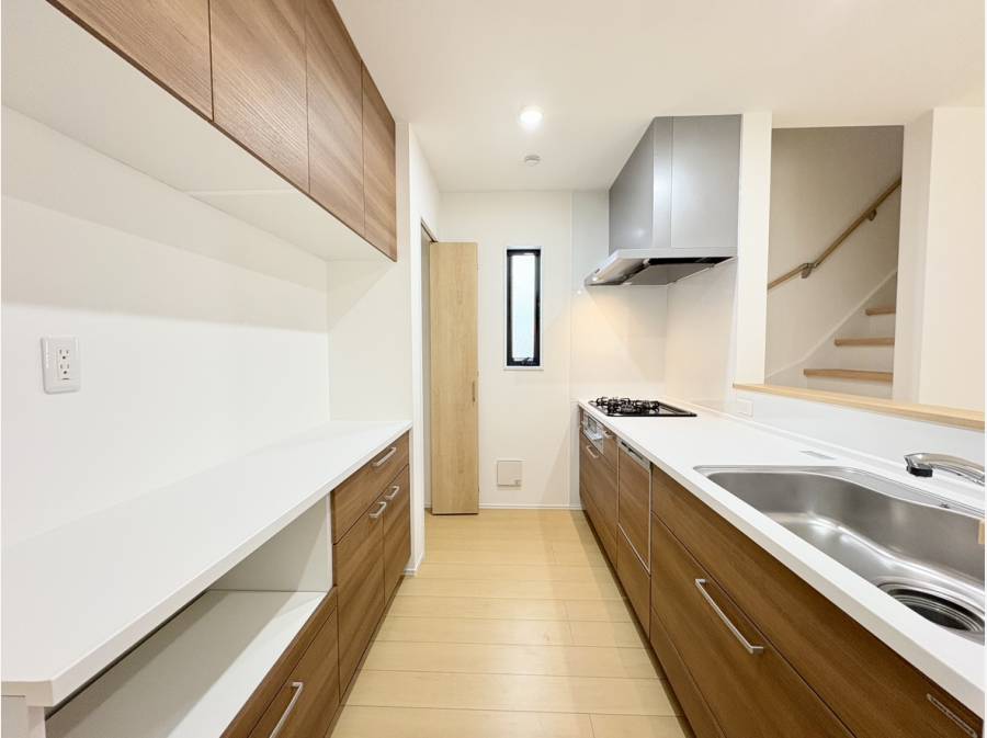 キッチンスペースにはカップボードとパントリーも備え、暮らしやすさに配慮された設計です