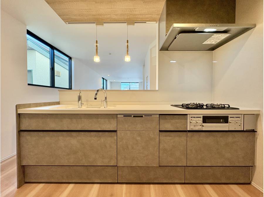 外壁はプラチナコート仕様で、キッチンにはタッチレス水栓を設置。リビングには床暖房を採用し、テレビの壁掛けにも対応しています。