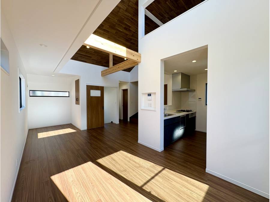 家族が自然と集まる、18.2帖の広々としたLDKが最大の魅力です。勾配天井を採用したことで、実際の面積以上に感じられるゆとりと明るさが特徴で、開放的な空間を演出しています。