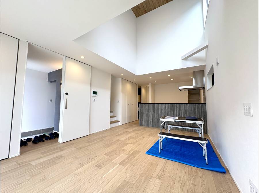 吹き抜けを取り入れたLDKは、家族の視線や声が自然に交わる空間で、温かいひとときを包み込む設計になっています。