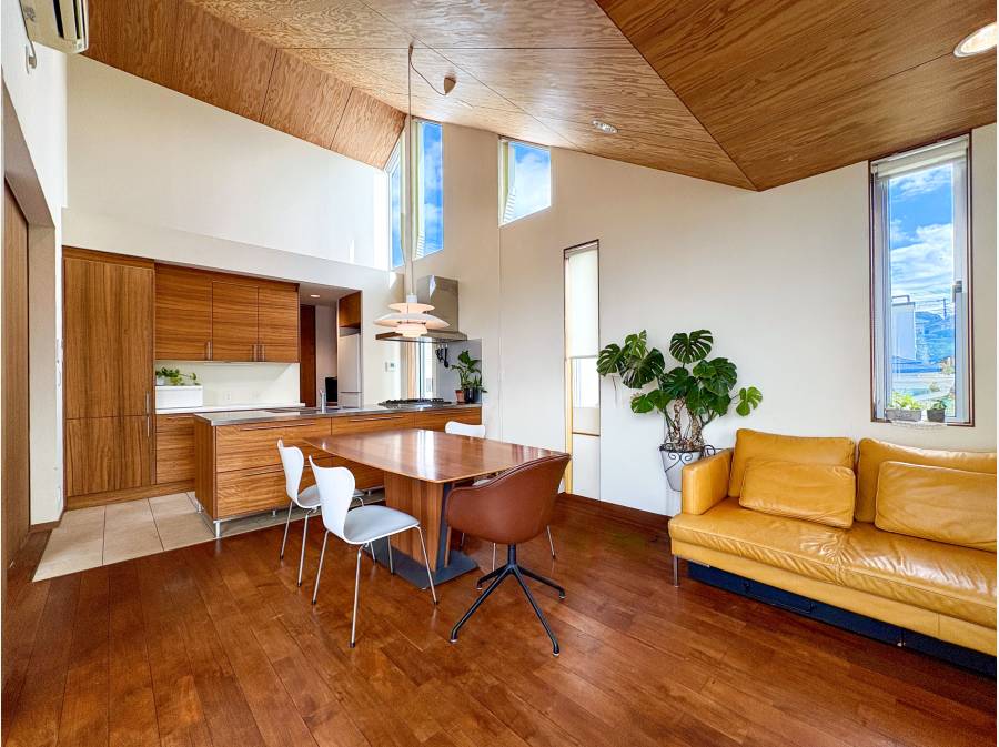 内装は自然素材を中心に組まれ、重厚感とナチュラルが共存した落ち着きある仕上がり。