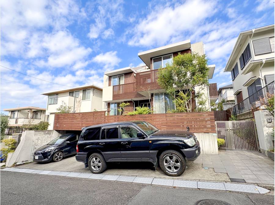 傾斜地を利用しカースペースを設けることで、建物1階部分が道路より高く、通りからは見上げるような形になっています。