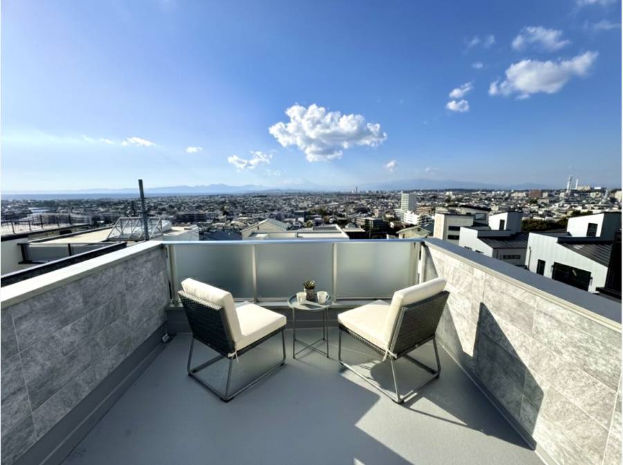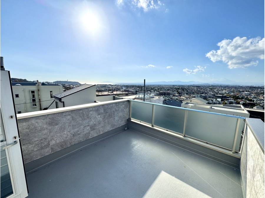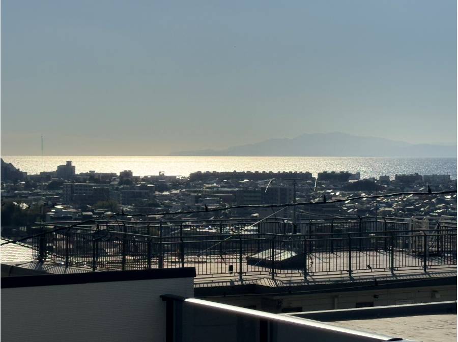 ルーフバルコニーからはキラリと光り輝く海辺と江ノ島を一望