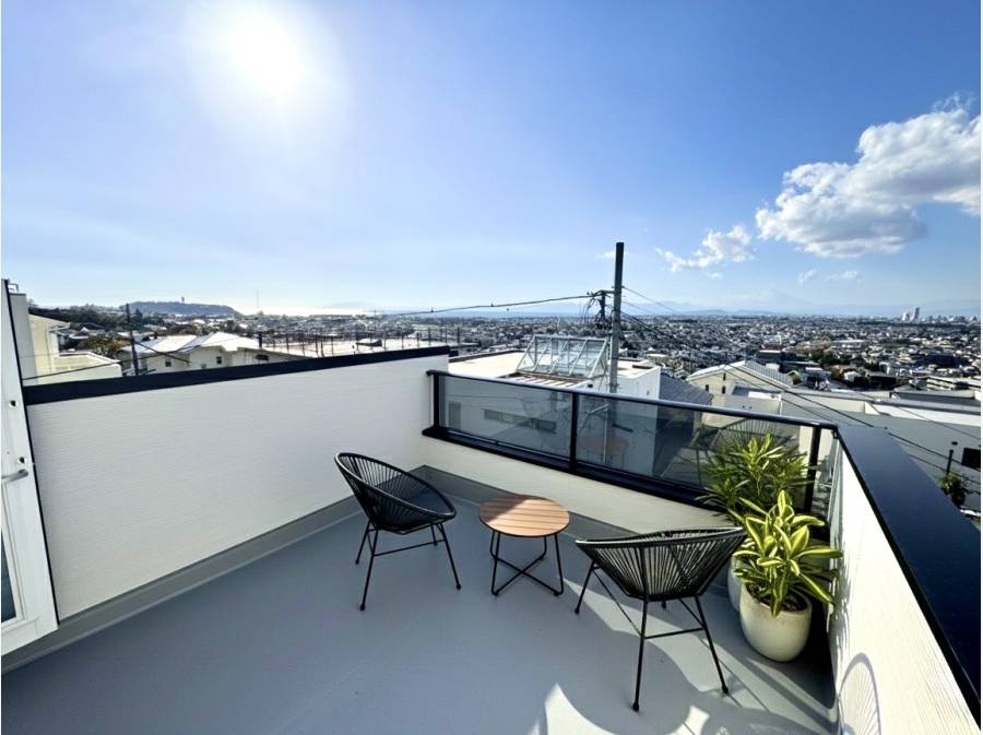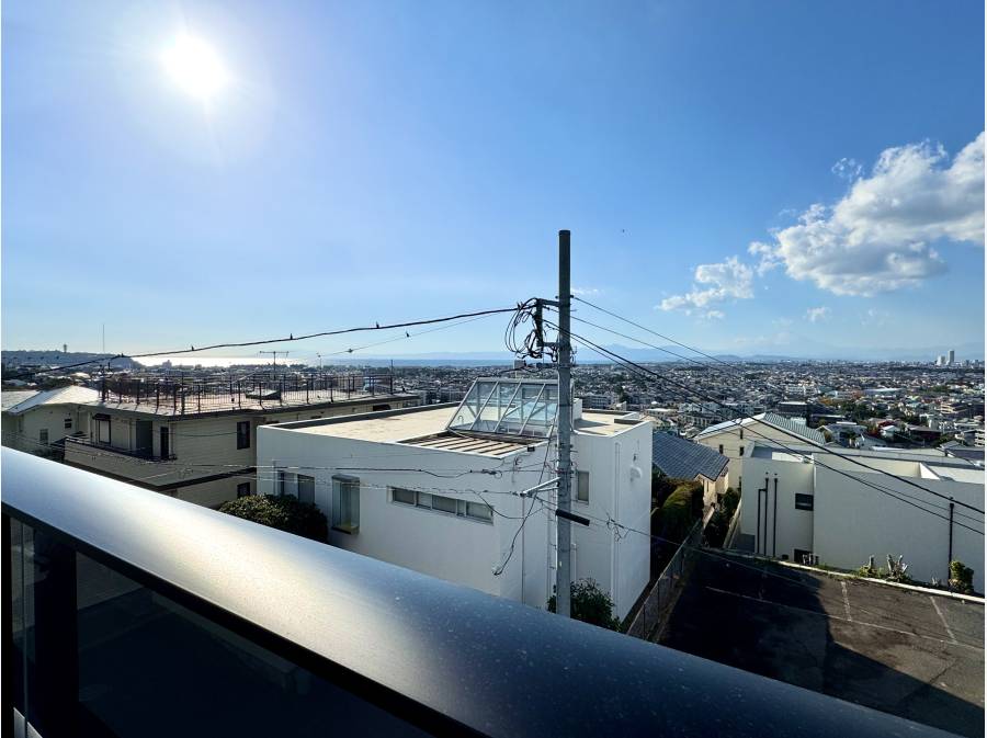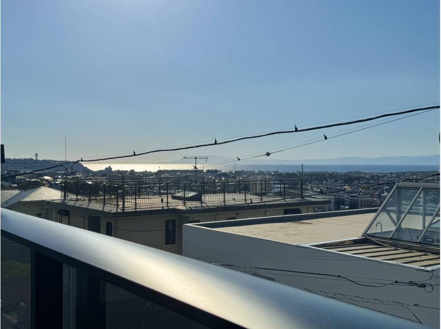 ルーフバルコニーからはキラリと光り輝く海辺と江ノ島を一望