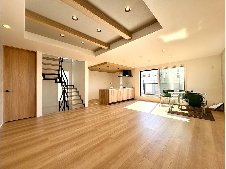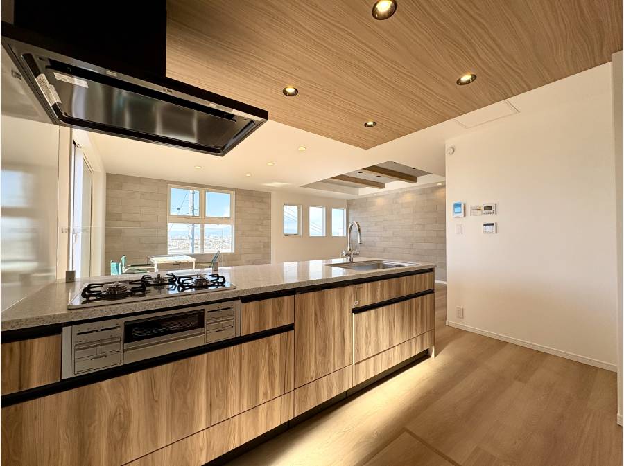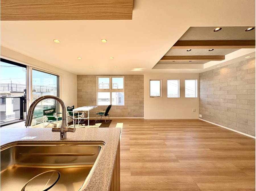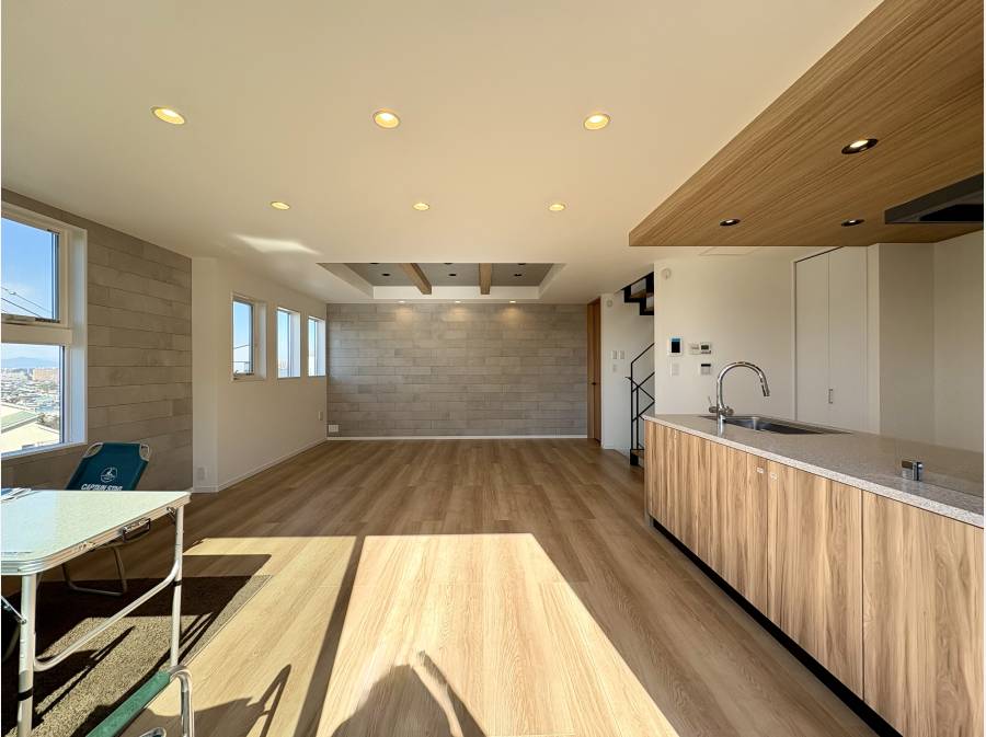 この住まいの大きな魅力は、2階に設けられた広々とした21.7帖のLDKです。ルーフバルコニーへとつながる動線が、開放感あふれる高台ならではの眺望を日常に取り込んでくれます。