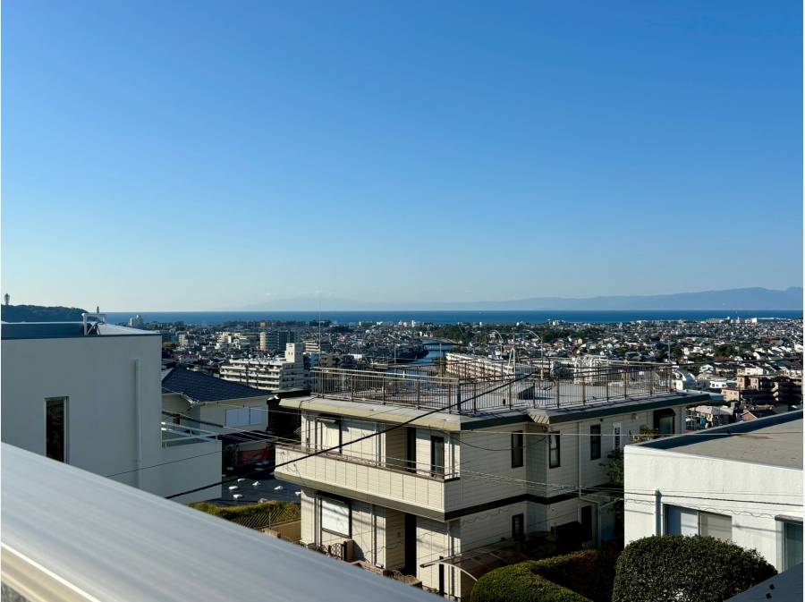 さらに、階段を上がった先のルーフバルコニーからは、街並みの先に広がる海と、その向こうに堂々とした富士山まで見渡すことができます。