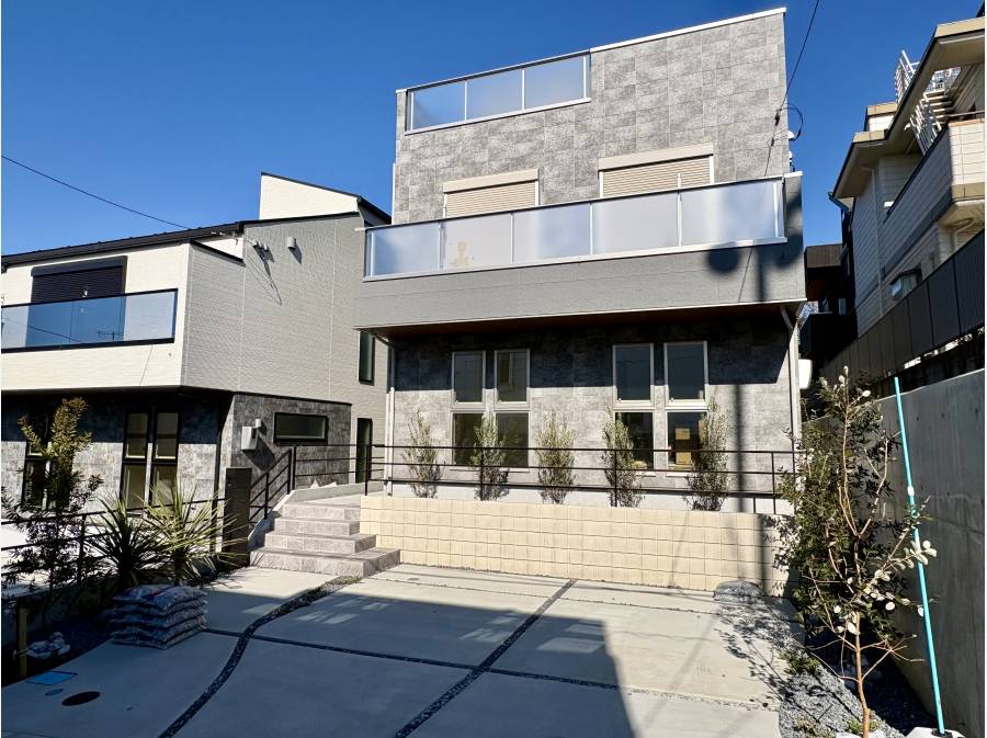 藤沢市内でも邸宅地として知られる「片瀬山1丁目」に、新築邸宅が誕生しました。ハウスメーカー施工による洗練されたデザインが特長です。
