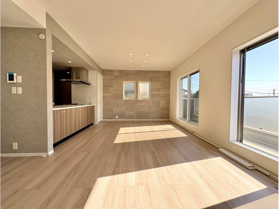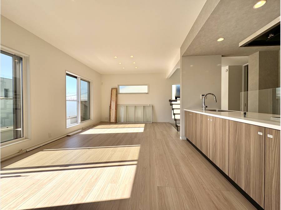 この住宅の魅力は、高台の立地を活かし「湘南エリアの眺望」を楽しめる設計にあります。2階のリビング・ダイニング・キッチンは約19帖の広々とした空間で、床暖房を備え快適さを追求。さらに、ルーフバルコニー(屋上テラス)への動線が開放感を演出します。