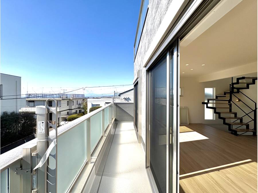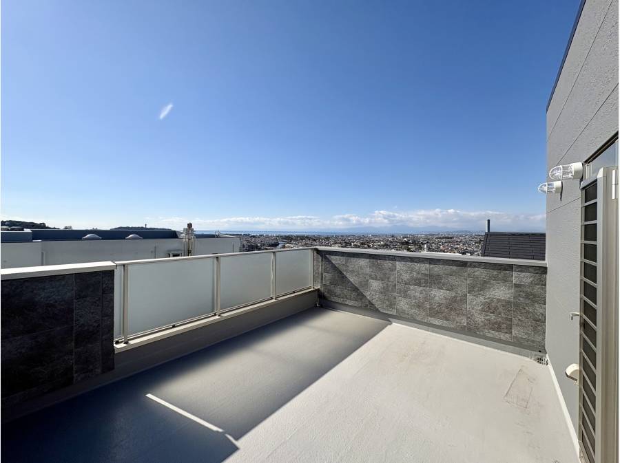 《海見え》片瀬山の空と風を独占する。認定長期優良住宅の安心と開放的なLDKが叶える。海を眺めるルーフバルコニー付きの新築邸宅