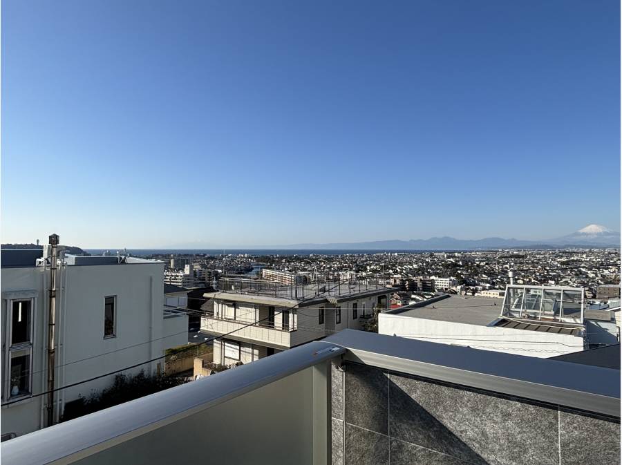 藤沢・片瀬山の高台に建つ「AQ TERRACE藤沢市片瀬山PJ」1号棟は、自然に溶け込む美しい景色が魅力です。周囲に視界を妨げる建物が少なく、空の広がりや街並みの奥行きを室内から感じられる贅沢な住まいです。
