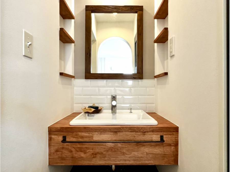 2階のLDKは約19.1帖の広さがあり、勾配天井とシーリングファンが相まって開放的な空間を演出しています。オリジナルのダイニングベンチや造作洗面台など、女性設計士ならではの細やかなデザインが随所に散りばめられています。