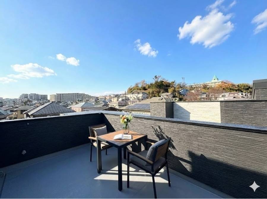 この家の魅力は、広々としたスカイバルコニー。晴れた日にはランチを楽しんだり、夜は星空の下でくつろいだりと、自宅でリゾートのような雰囲気を味わえます。