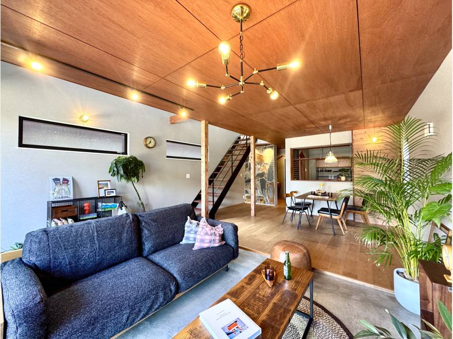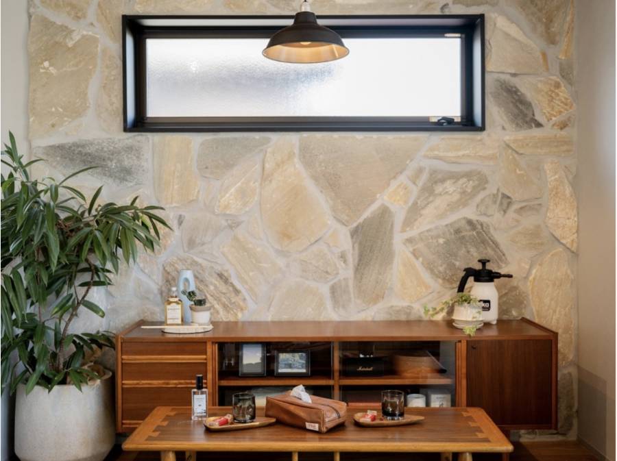 石張りや板張り素材感を大切にしたリビングは20帖の広い空間
